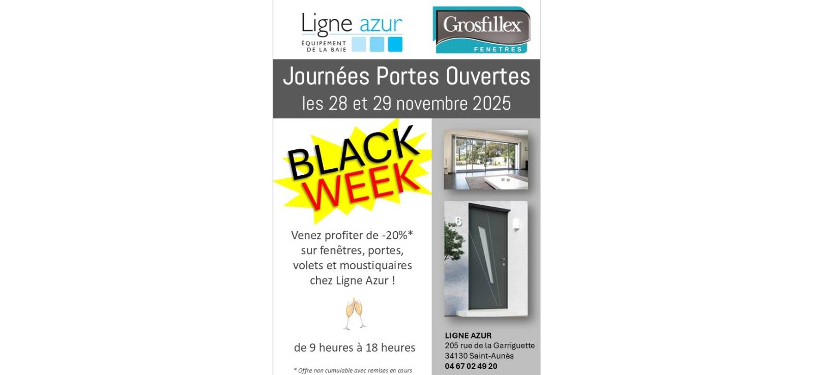À l’occasion de la Black Week, Ligne Azur organise deux Journées Portes Ouvertes exceptionnelles dans son showroom de Saint-Aunès, près de Montpellier. Venez découvrir nos solutions de menuiseries sur mesure et profiter d’une remise exclusive de -20%* sur une large sélection de produits.