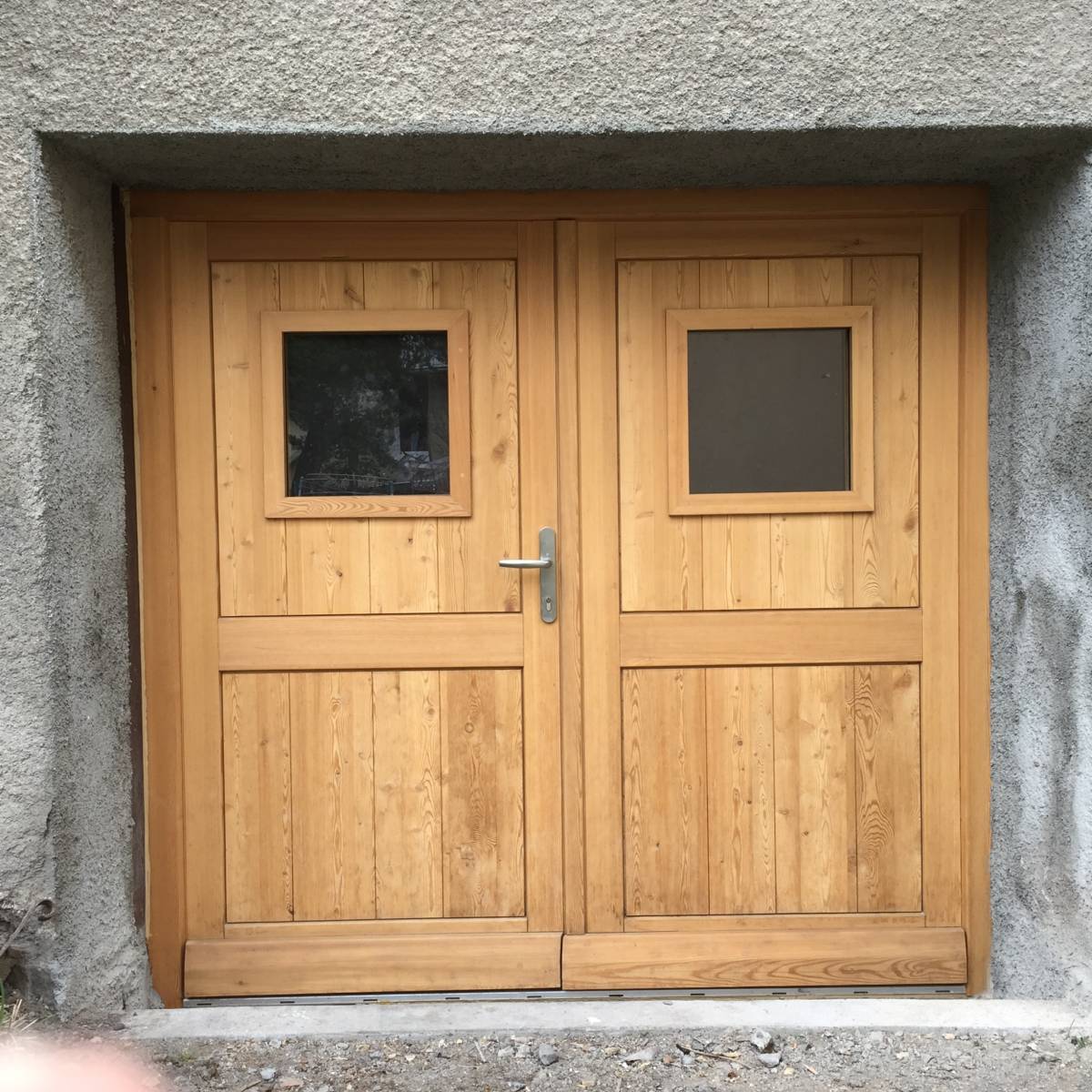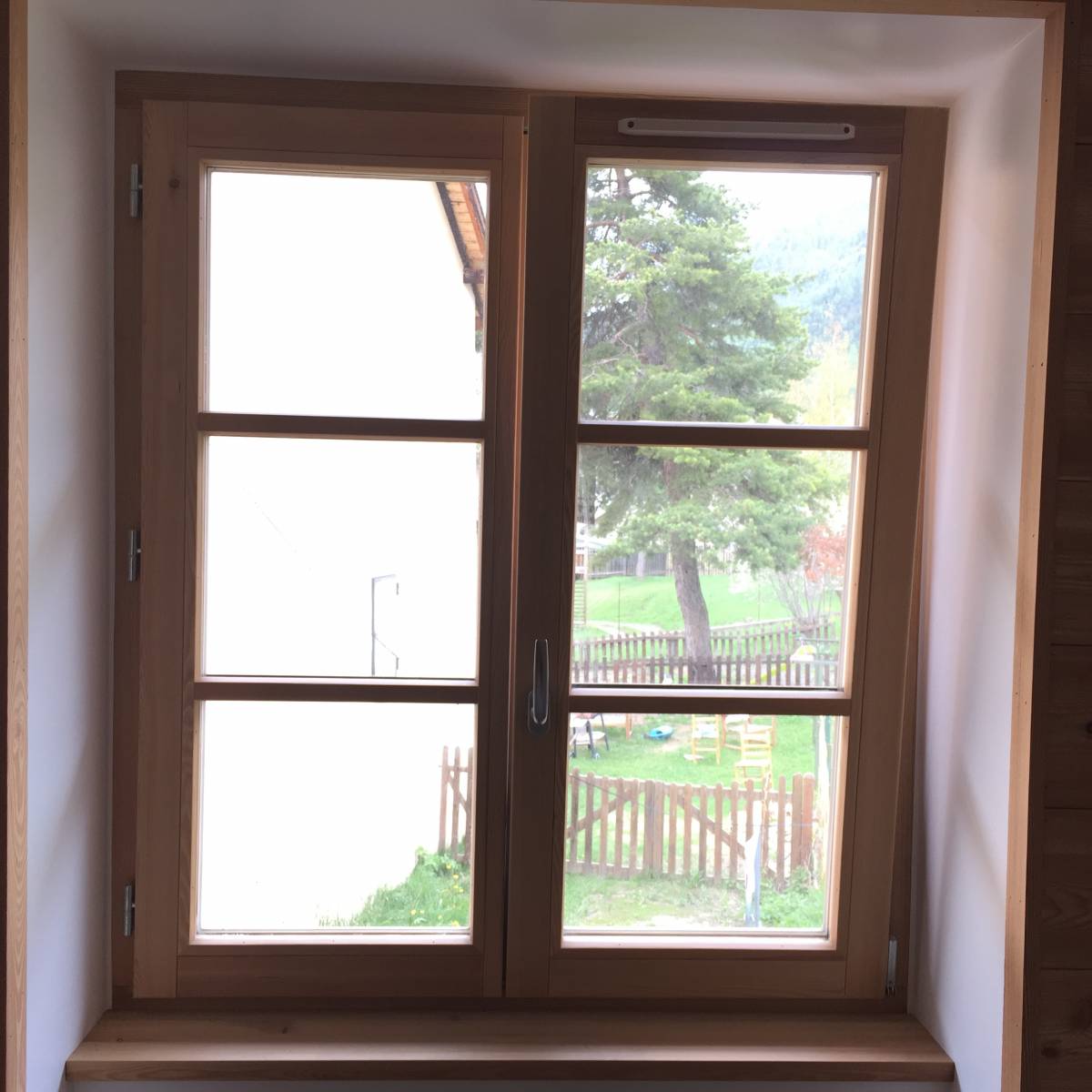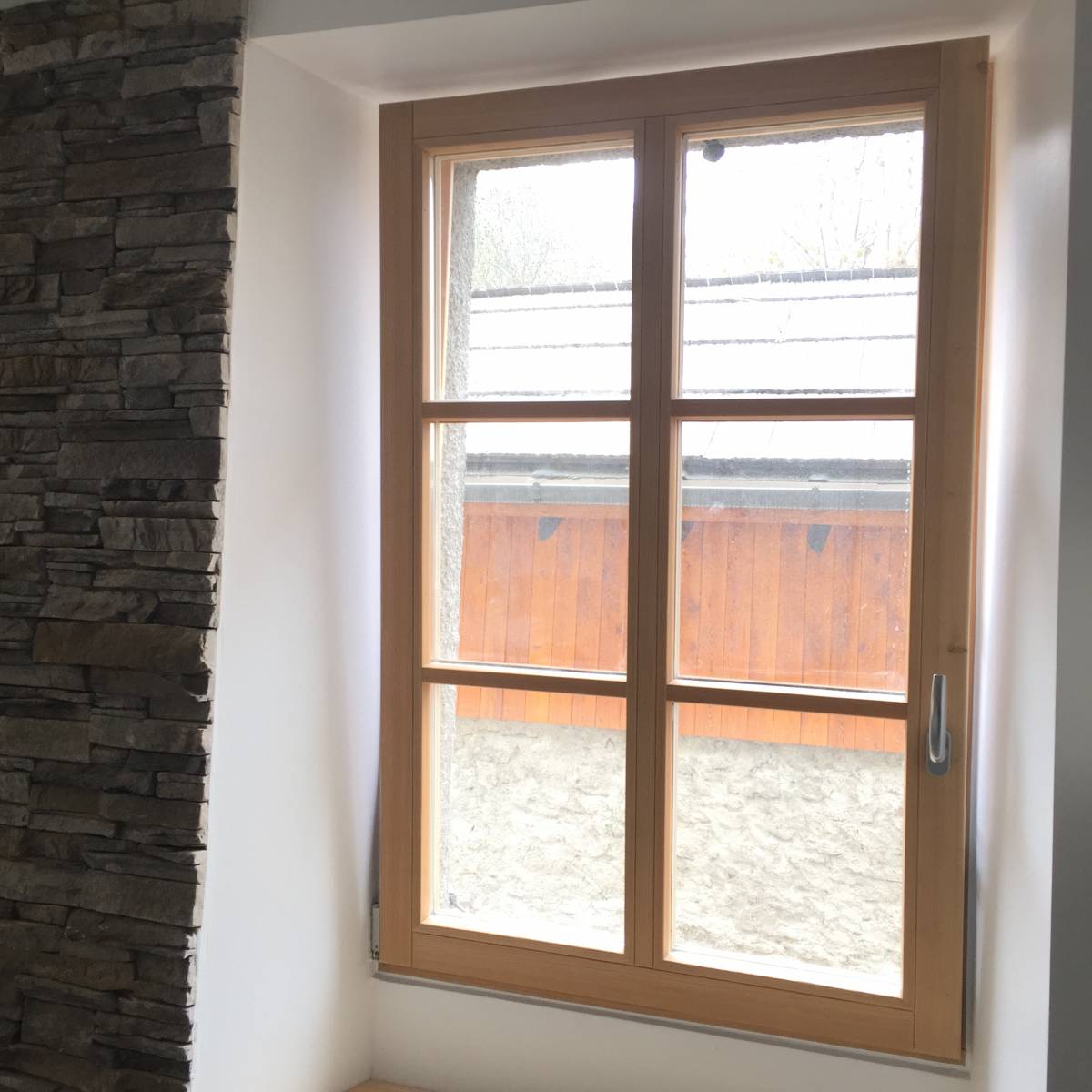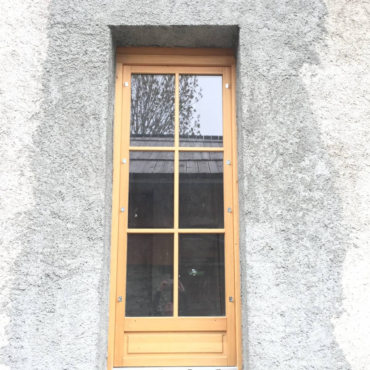 Les anciennes menuiseries en bois hors d'usage ont été entièrement déposées et les huisseries choisies l'ont été en respectant la tradition : bois, petits bois tenons mortaises et ce en couleur naturelle, seulement huilées. Les dimensions ont été aussi imposées par les Bâtiment de France.