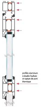 Un bâti de 64 x 50 mm et des profilés avec double feuillure, en aluminium, à rupture de pont thermique