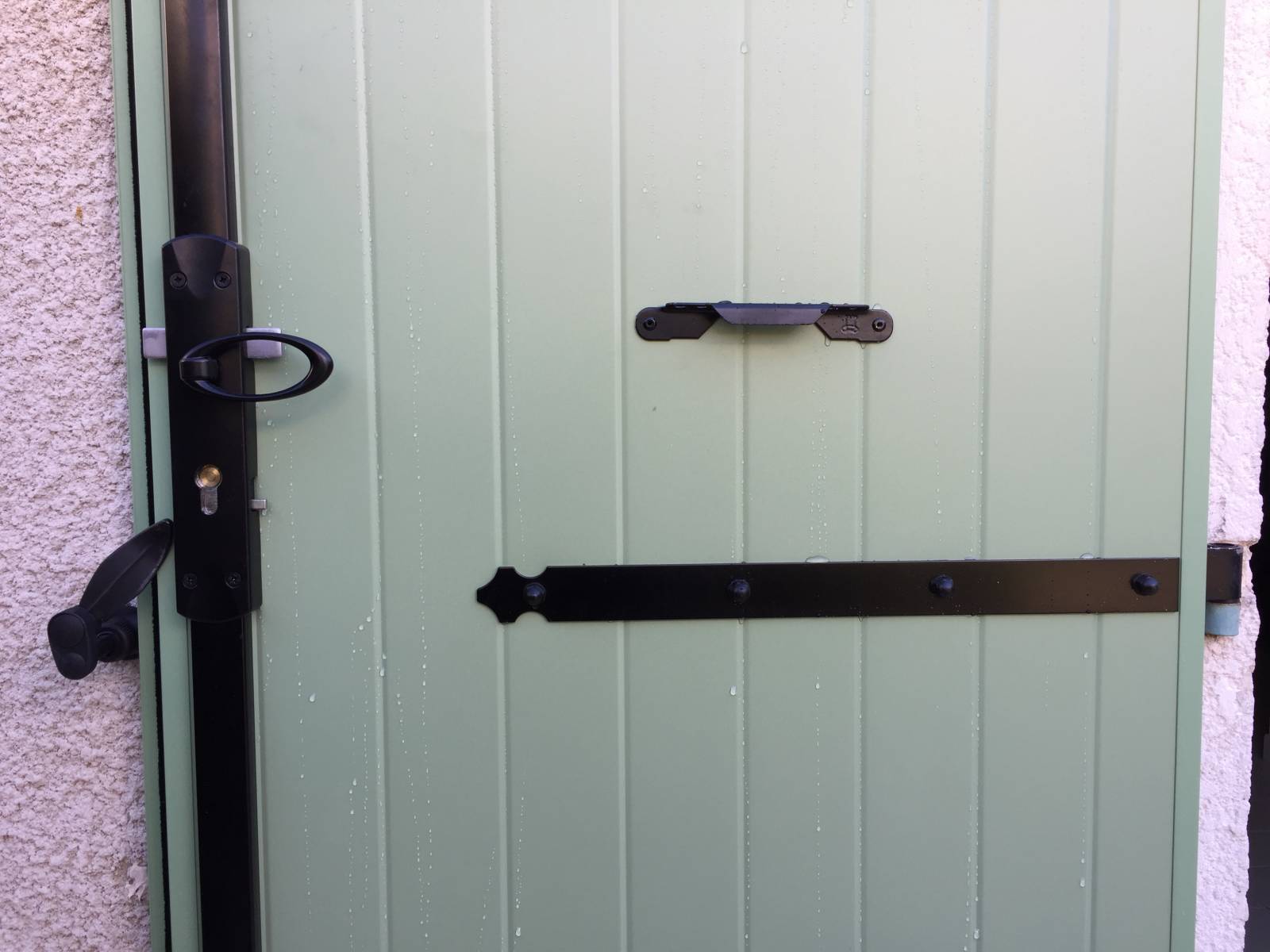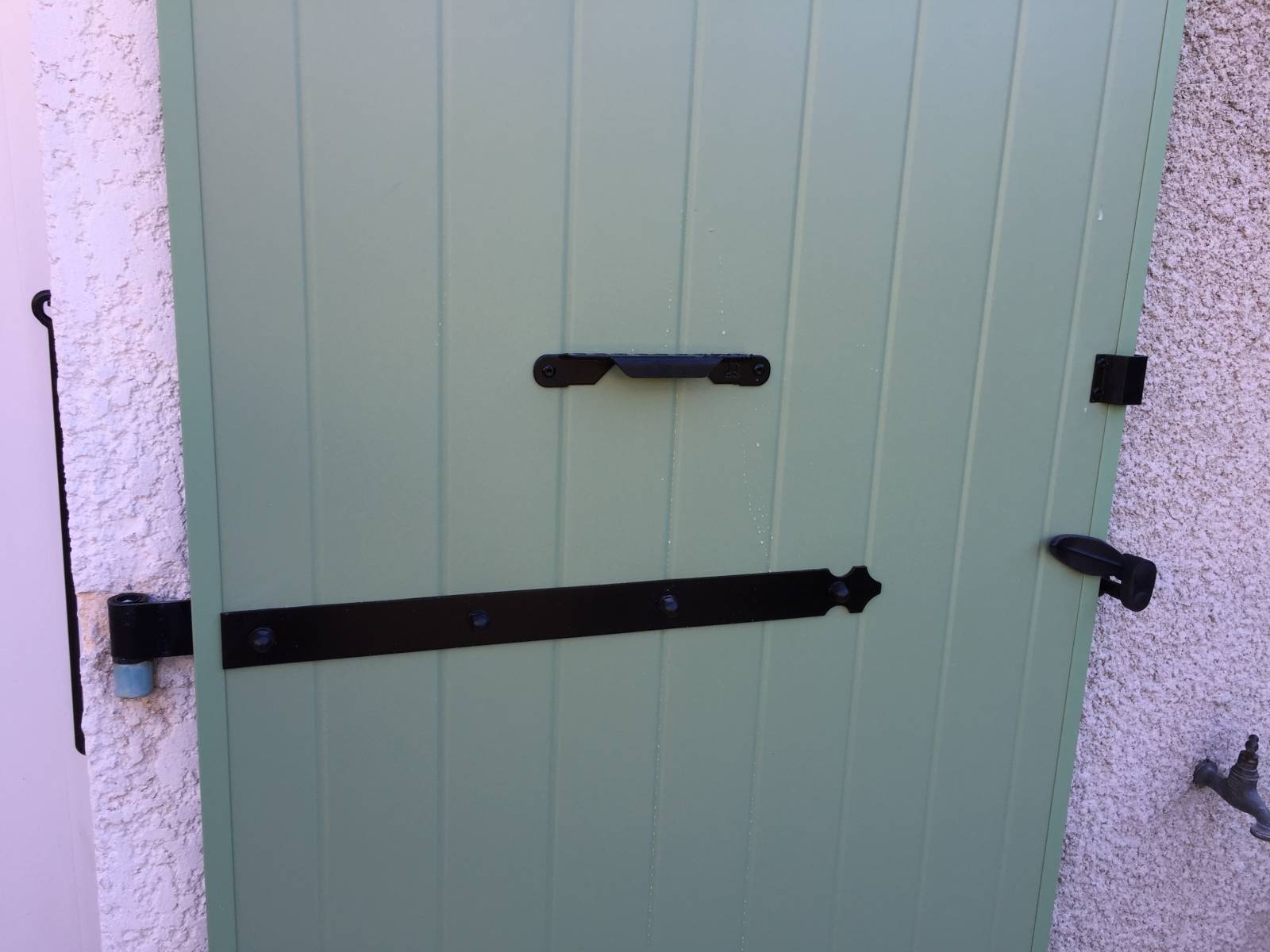 Ici le volet de la porte fenêtre sert de porte d'entrée, il est donc équipé d'une serrure carénée 3 points en applique intérieure avec 1/2 cylindre, ce qui veut dire que de l'intérieur nul besoin de la clé pour verrouiller le volet. De l'extérieur un anneau escamotable permet de mouvoir la crémone.