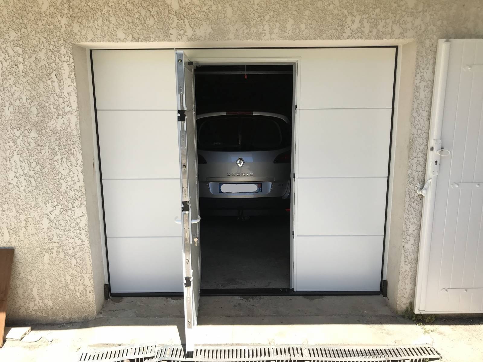 La faisabilité technique validée, nous sommes convenus d’une porte sectionnelle blanche, acier Carsec Pro de Soprofen, motorisée et bien sûr avec un portillon intégré au milieu de la sectionnelle.